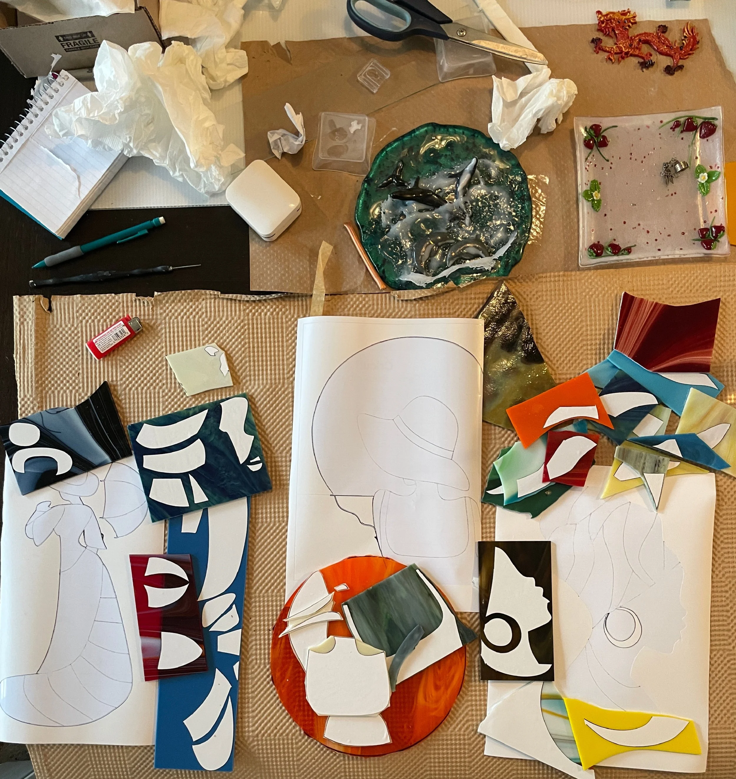 Making one of a kind pieces with the use of glass powders, glass clay, crushed glass, molds and careful timing in the kiln. Each piece has its own desired temperature to mature to the piece it would like to be.
